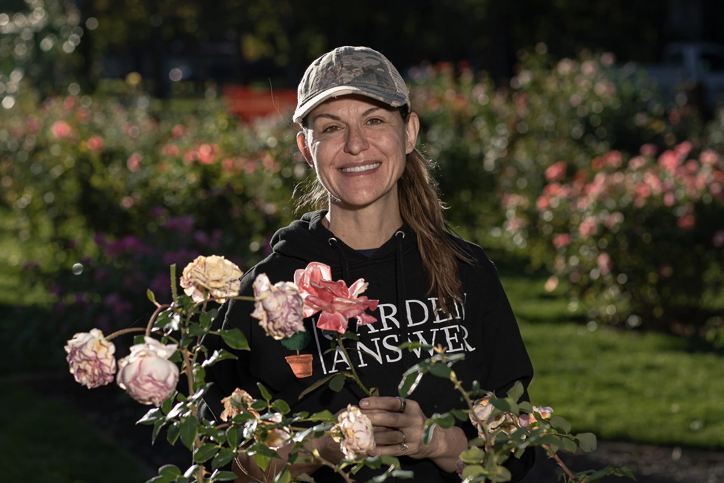 Mindy Leroy, standing with her favorite roses, is the head of the Rose Society in Boise. She records the history of the Rose Garden and the Rose Society.